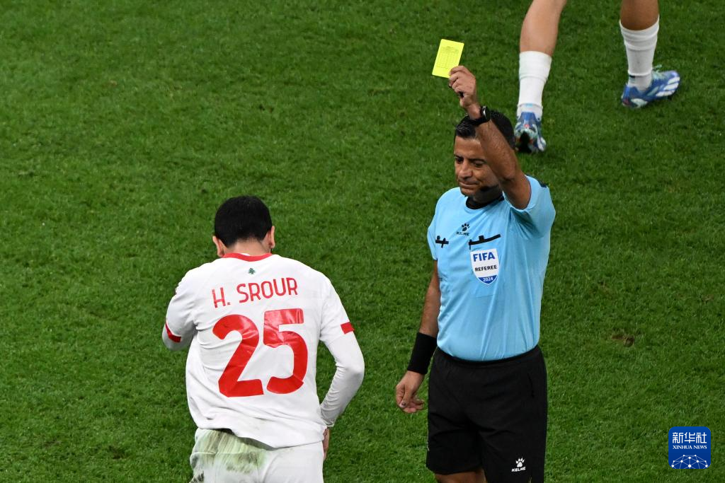 1月12日,主裁判法加尼(右)向黎巴嫩队球员哈桑·苏鲁尔出示黄牌。新华社记者 孙凡越 摄