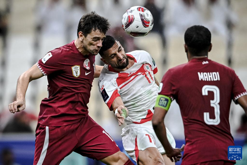 1月12日,卡塔尔队球员卢卡斯·门德斯(左)在比赛中与黎巴嫩队球员奥马尔·沙班(中)争顶头球。新华社记者 江汉 摄