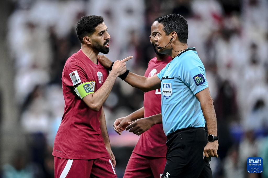 1月12日,卡塔尔队球员哈桑·海多斯(左)在本队第一粒进球被判罚无效后与裁判交涉。新华社记者 江汉 摄