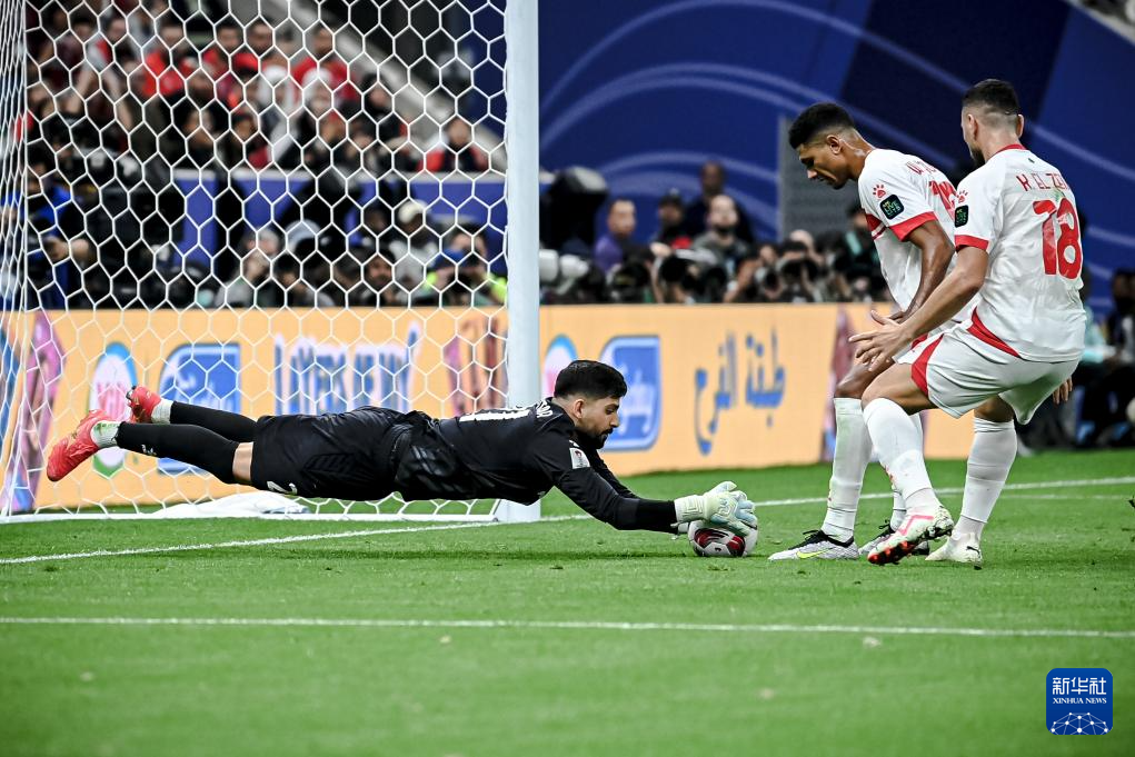 1月12日,黎巴嫩队守门员穆斯塔法·马塔尔(左)在比赛中扑救。新华社记者 江汉 摄