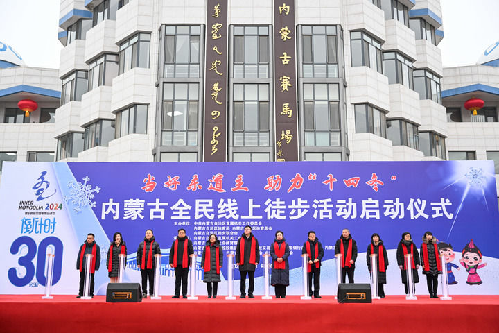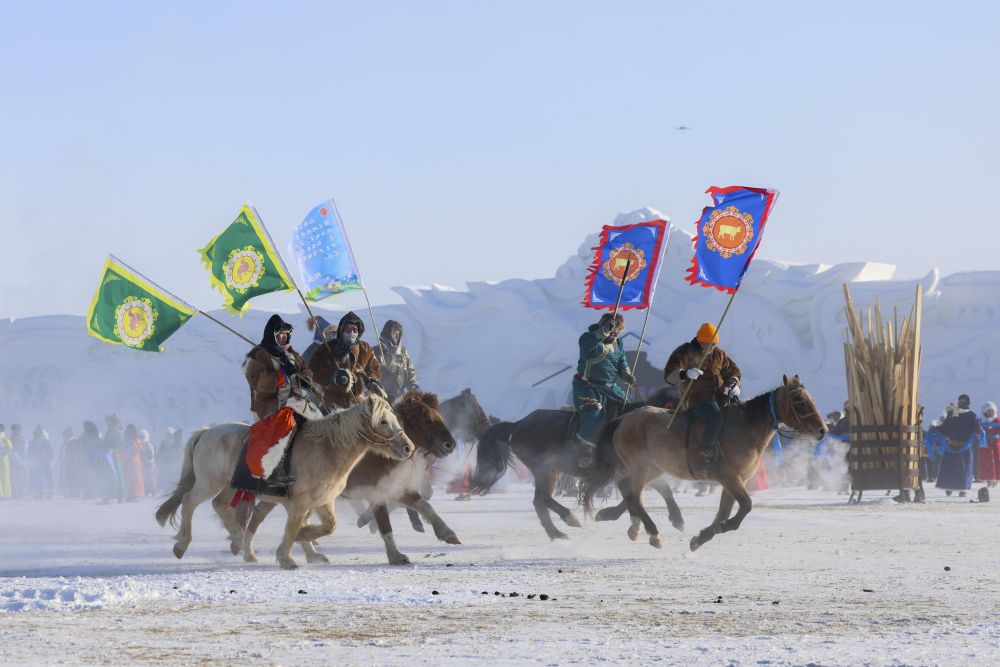 ↑2023年12月7日,赛马选手在内蒙古自治区第二十届冰雪那达慕开幕式上入场。新华社记者王楷焱摄