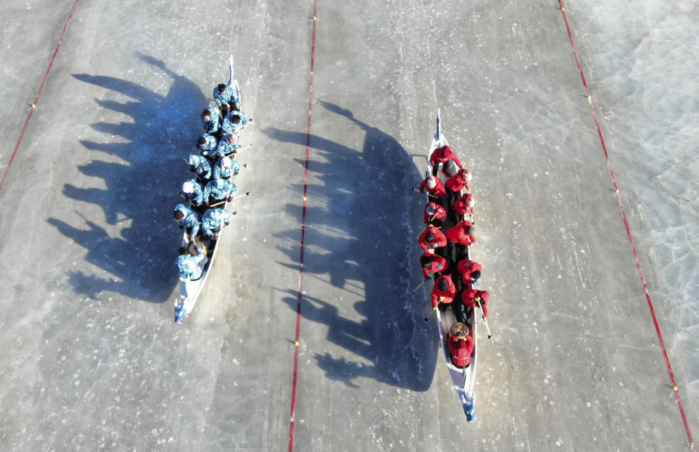 ↑2019年1月25日,在内蒙古自治区多伦县举行的十四冬冰上龙舟项目测试赛上,选手在奋力前行(无人机拍摄)。新华社记者邹予摄