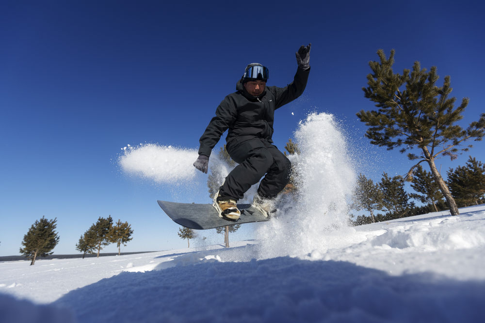 ↑2023年1月15日,在内蒙古呼伦贝尔市新巴尔虎左旗,蒙古族青年布赫·巴雅尔在练习滑雪技巧。新华社记者费茂华摄