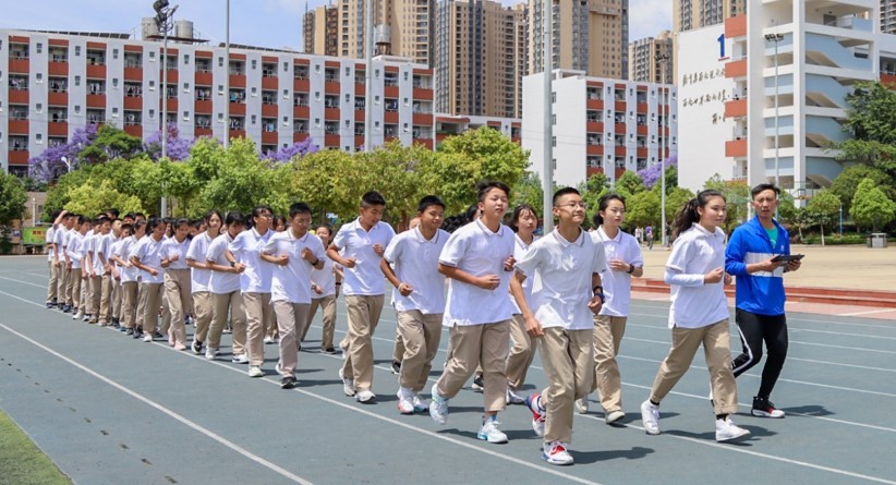 昆明市第一中学西山学校的学生练跑步。