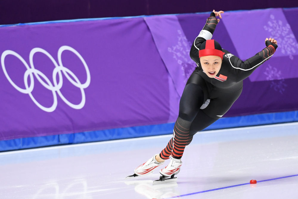 2018年2月18日,运动员张虹在2018年平昌冬奥会速度滑冰女子500米比赛中。新华社记者 鞠焕宗 摄