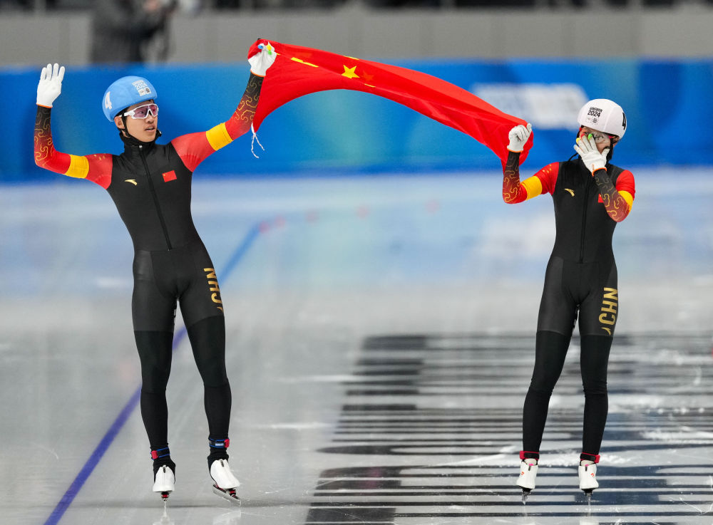 1月25日,潘宝硕(左)/刘昀琪在速度滑冰混合接力决赛后庆祝夺冠。新华社记者 张笑宇 摄