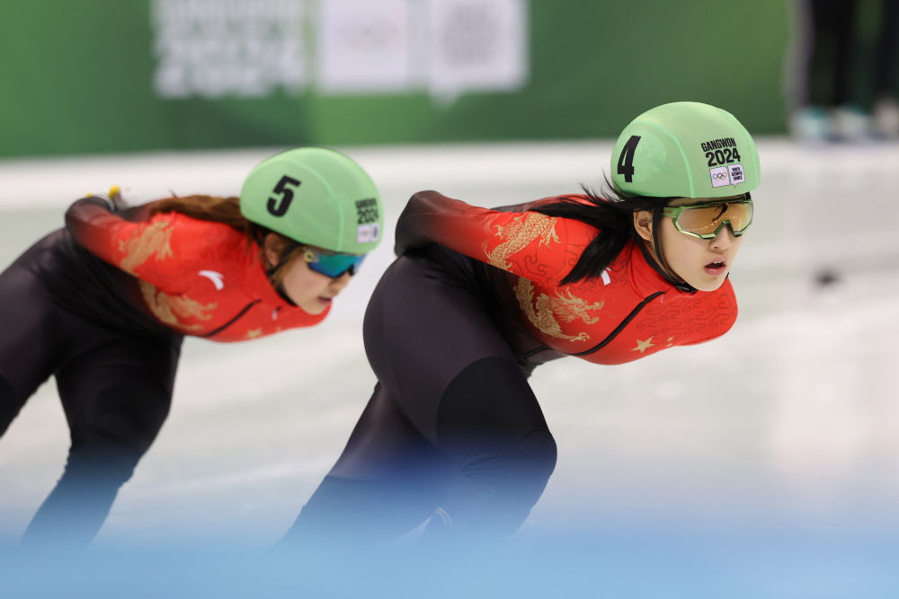 1月20日,中国选手杨婧茹与李金恣(右)在短道速滑女子1500米决赛中。新华社记者 许雅楠 摄
