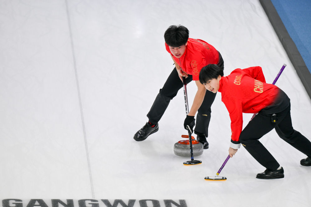 1月27日,中国选手龚长玉婷(右)和许博康在冰壶混合双人循环赛中。新华社记者 朱炜 摄