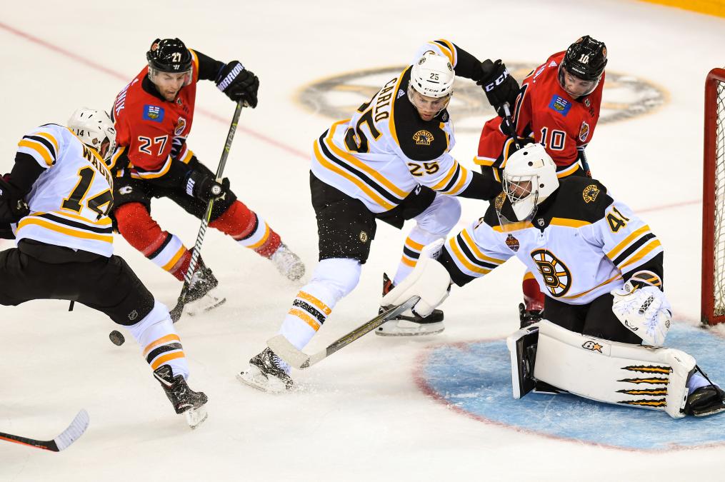 资料图:2018年9月15日,波士顿棕熊队守门员亚罗斯拉夫·哈拉克(前右)在比赛中防守。当日,2018年NHL(北美职业冰球联赛)中国赛在深圳拉开战幕。新华社记者 毛思倩 摄