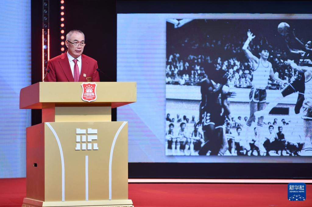2月4日,2023年中国篮球名人堂入堂人物匡鲁彬在仪式上致辞。新华社记者 张博文 摄
