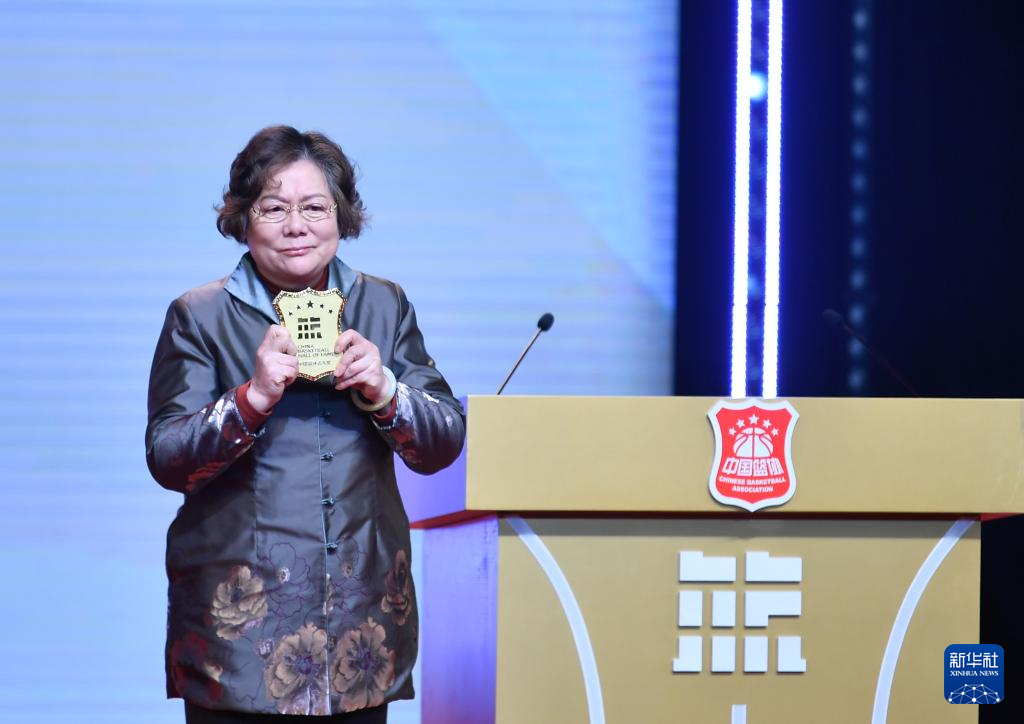 2月4日,2023年中国篮球名人堂“特别致敬集体”、八路军第120师战斗篮球队后人代表在仪式上接受鲜花和奖杯。新华社记者 张博文 摄