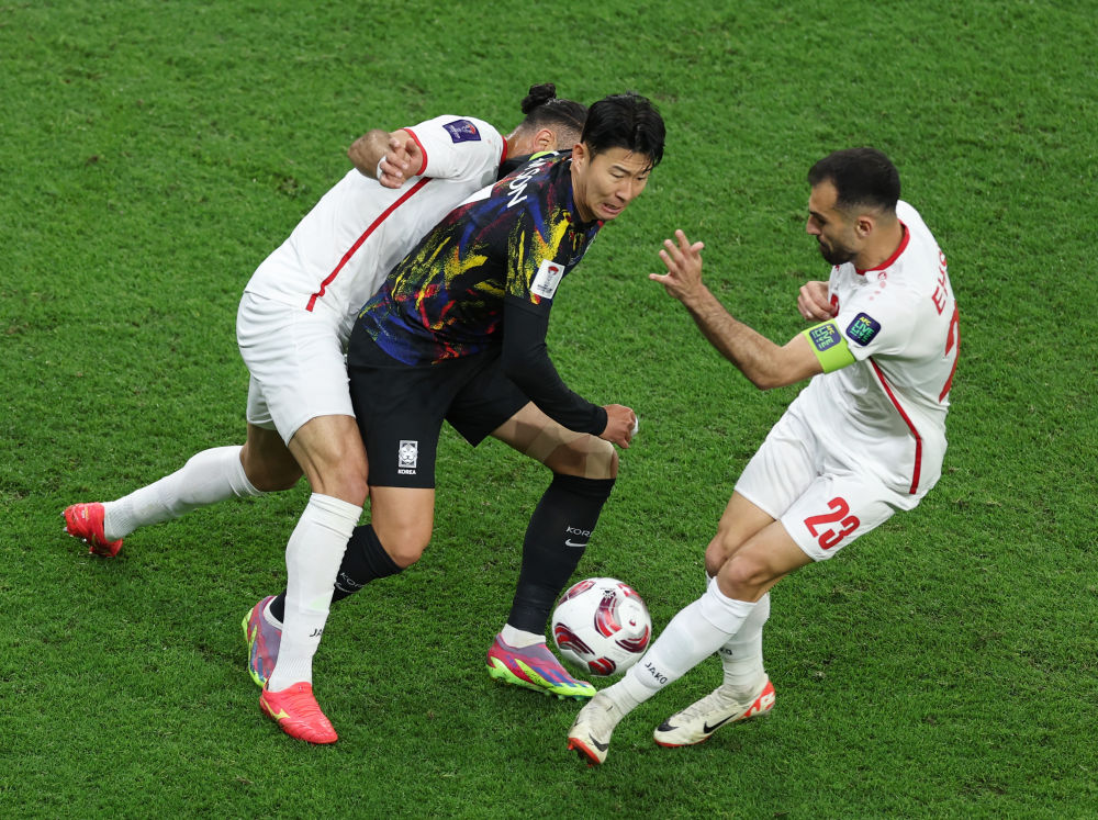 2月6日,韩国队球员孙兴慜(中)在比赛中拼抢。新华社记者 贾浩成 摄