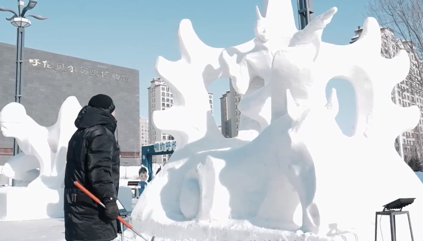 为了庆祝“十四冬”的成功举办,他以驯鹿、蒙古马和单板滑雪的人物造型为元素,创作了一系列雪雕艺术作品,用手中的一把雪铲,和热爱家乡的“一片冰心”,为“十四冬”增添光彩。