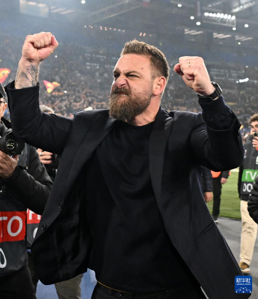 2月22日,罗马队主教练德罗西在比赛后庆祝。新华社发(阿尔贝托·林格利亚摄)