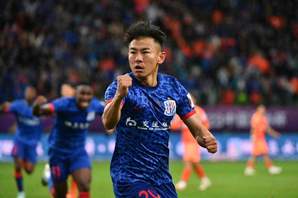 2023年11月25日,上海申花队球员于汉超在比赛中庆祝得分。新华社发(史康摄)