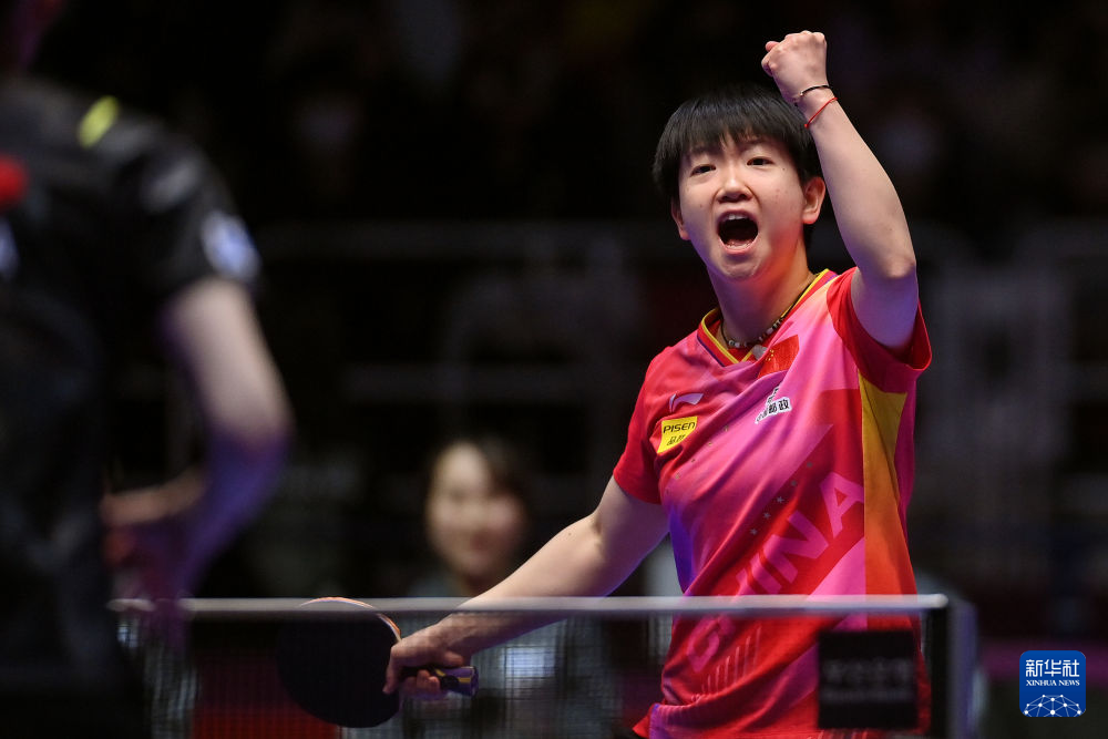 2月24日,中国队选手孙颖莎在第四盘比赛中庆祝得分。新华社记者 陶希夷 摄