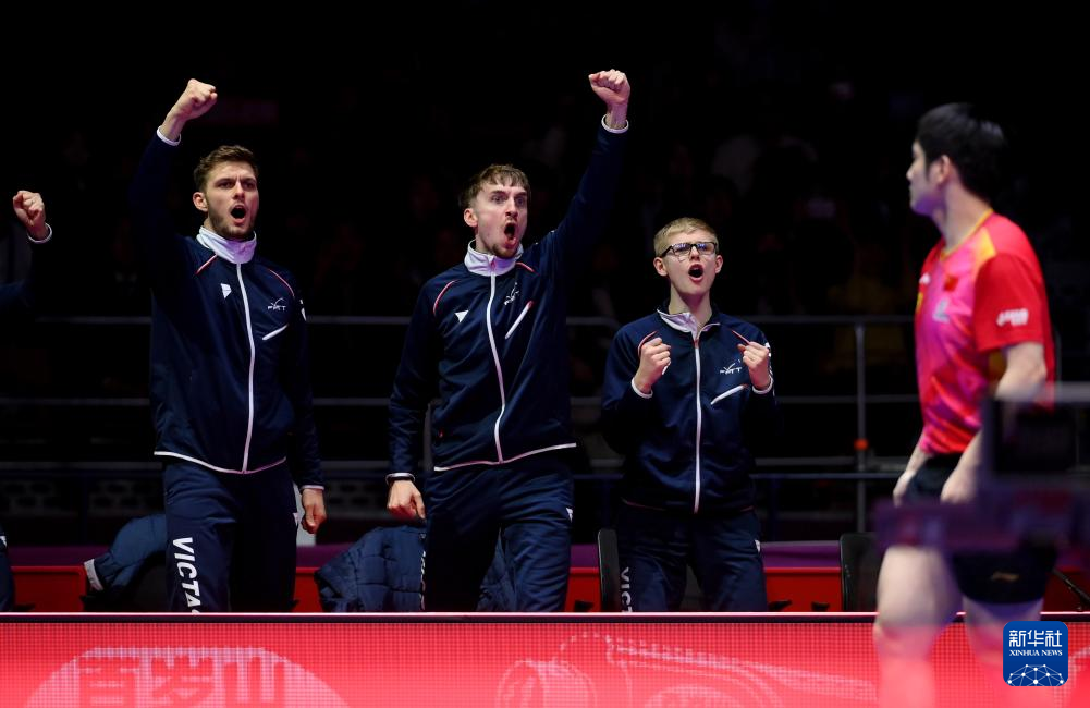 2月25日,法国队在第二盘比赛中庆祝艾利克斯·勒布伦得分。艾利克斯·勒布伦2比3不敌中国队选手樊振东。新华社记者 陶希夷 摄