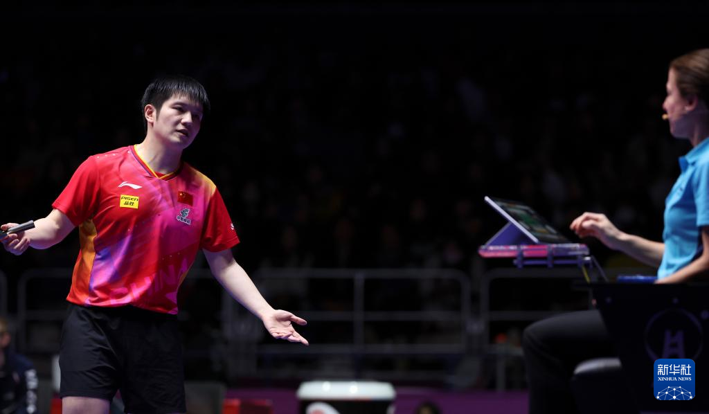 2月25日,樊振东被判罚黄牌后与裁判交流。新华社记者 姚琪琳 摄