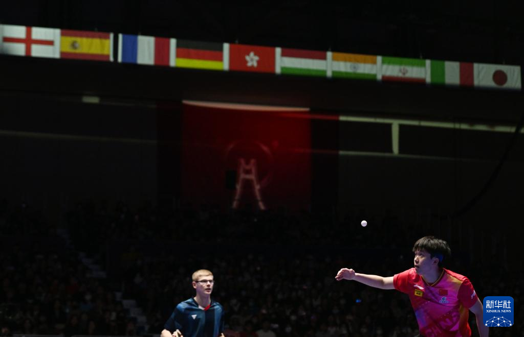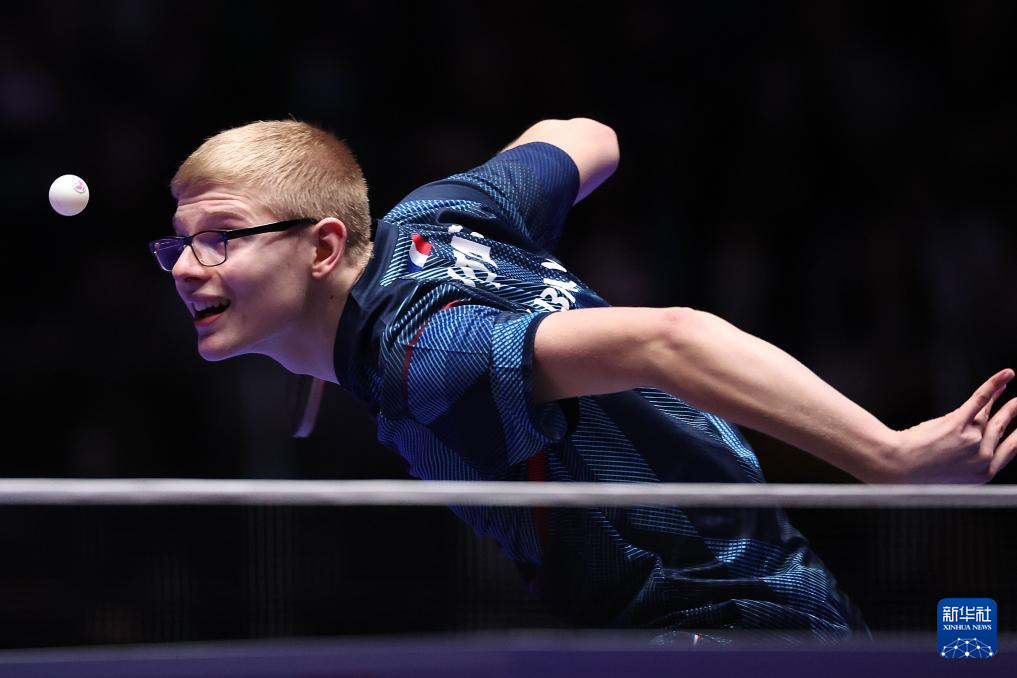 2月25日,中国队选手王楚钦在第一盘比赛中回球,他3比0战胜法国队选手费利克斯·勒布伦。新华社记者 杨世尧 摄