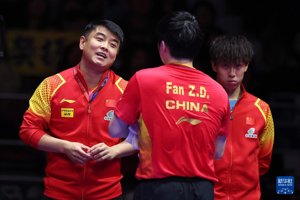 2月25日,中国队教练王皓(左)在场边指导选手樊振东。樊振东3比2战胜法国队选手艾利克斯·勒布伦。新华社记者 杨世尧 摄