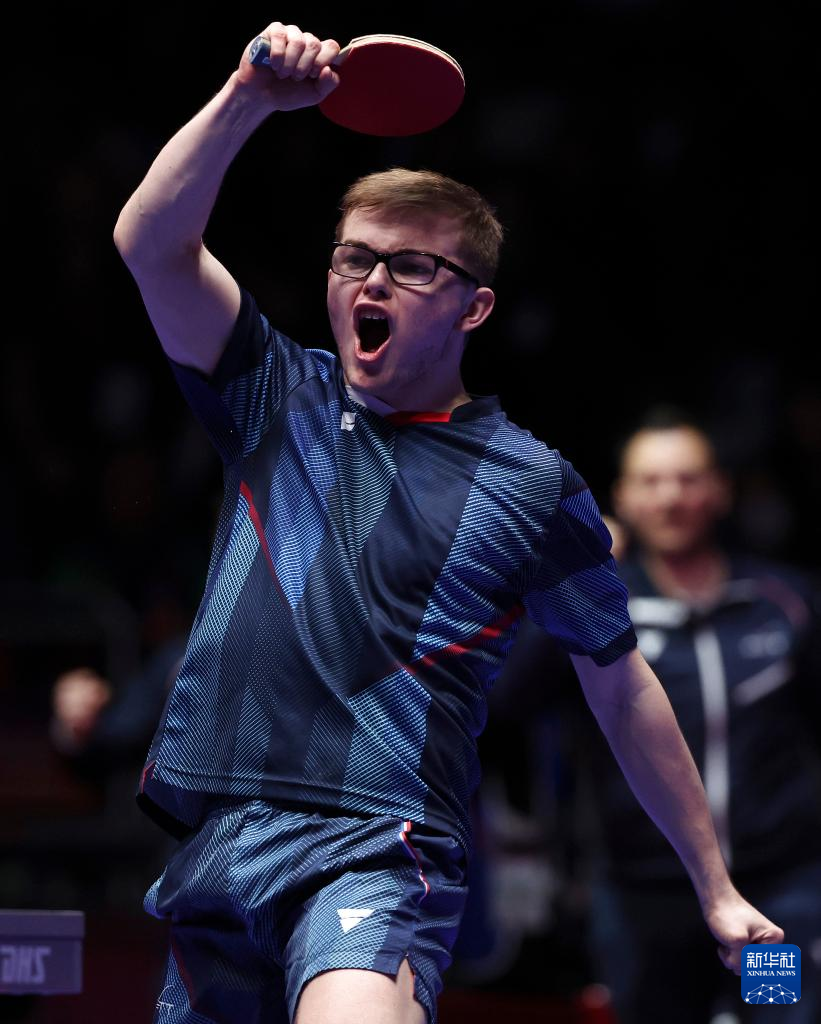 2月25日,法国队选手费利克斯·勒布伦在第一盘比赛中庆祝得分,他0比3不敌中国队选手王楚钦。新华社记者 杨世尧 摄