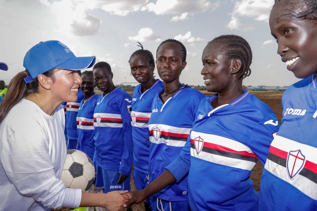 2月21日,联合国难民署亲善大使、奥运冠军杨扬(左前)与卡库马难民营女子足球队队员交流。新华社发(联合国难民署供图)