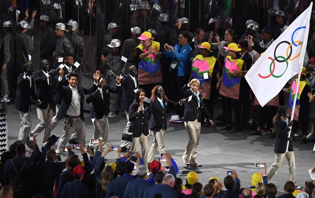 2016年8月5日,难民代表团在2016年里约奥运会开幕式上入场。这是历史上第一次有难民代表团参加夏季奥运会。新华社记者 刘大伟 摄