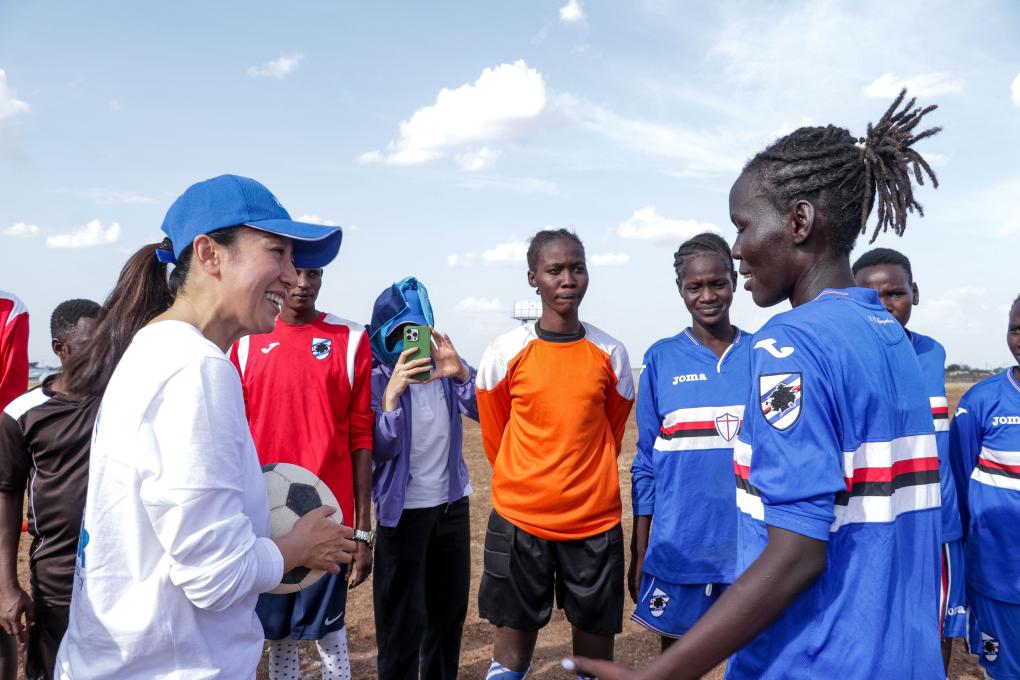 2月21日,联合国难民署亲善大使、奥运冠军杨扬(左)与卡库马难民营女子足球队队员交流。新华社发(联合国难民署供图)