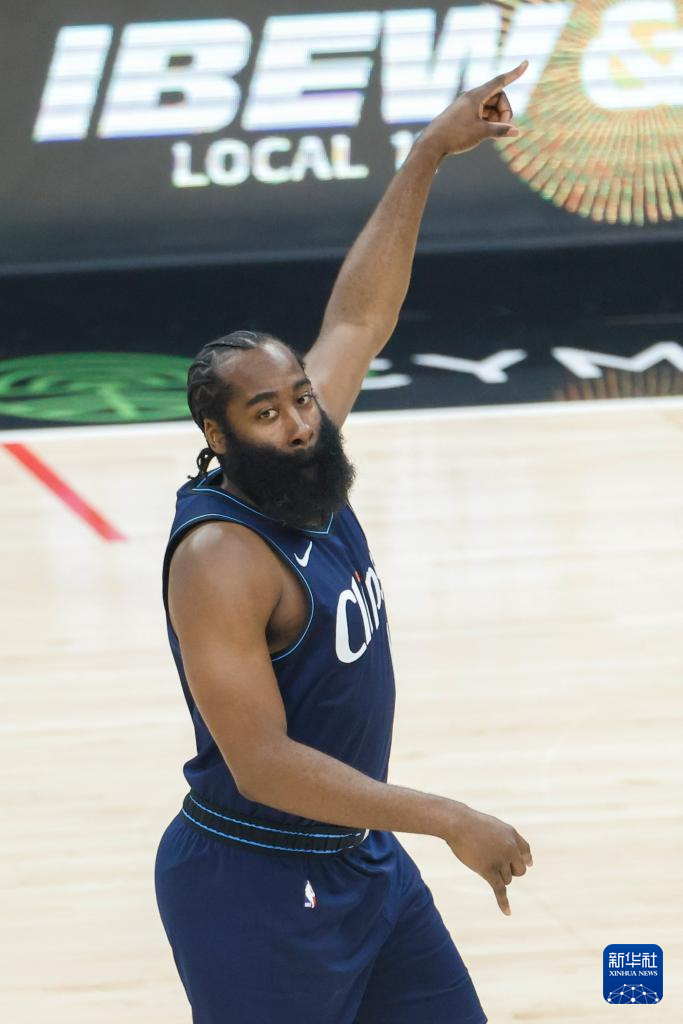 3月1日,快船队球员哈登在比赛中庆祝得分。