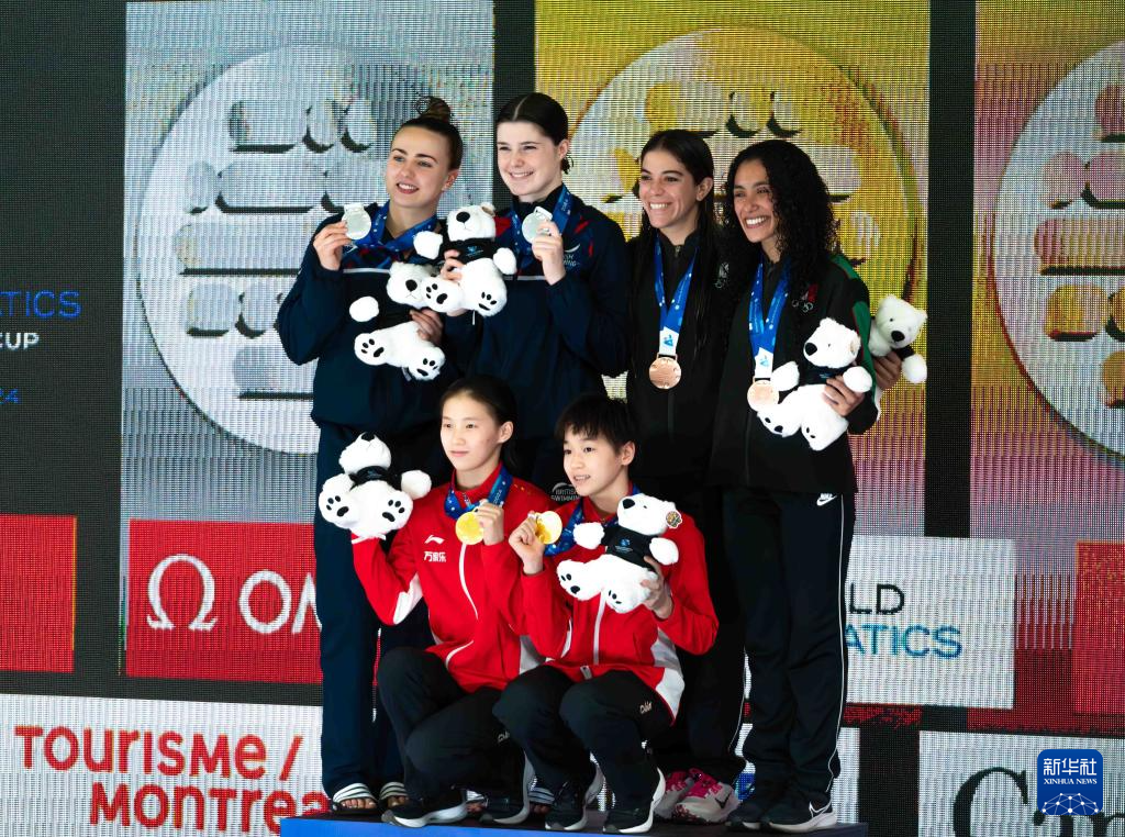 3月2日,冠军中国组合陈芋汐(左二)/全红婵(右二)在颁奖仪式上。新华社发(刘佳欢摄)