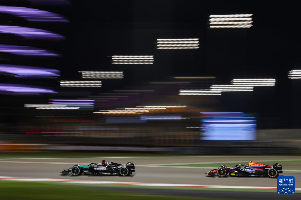 3月2日,佩雷兹(右)与梅赛德斯车队英国车手拉塞尔在比赛中。新华社发(钱俊摄)