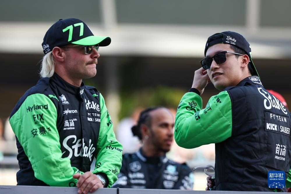 3月2日,索伯车队中国车手周冠宇(右)和队友芬兰车手博塔斯在赛前车手巡游活动中。新华社发(钱俊摄)