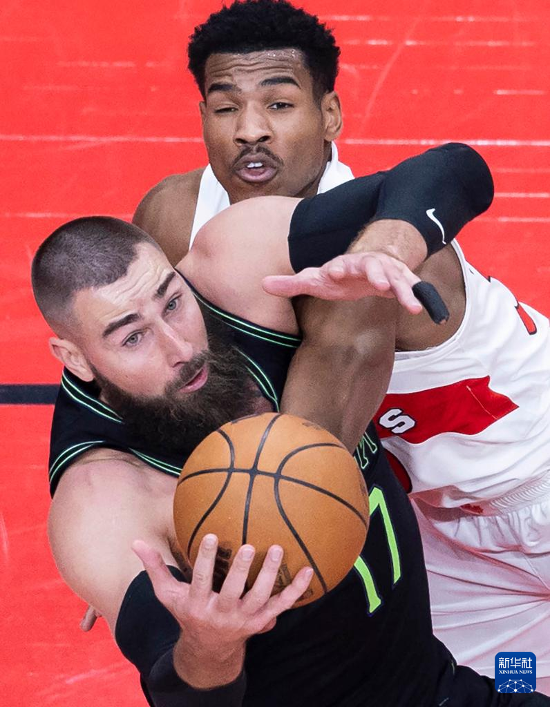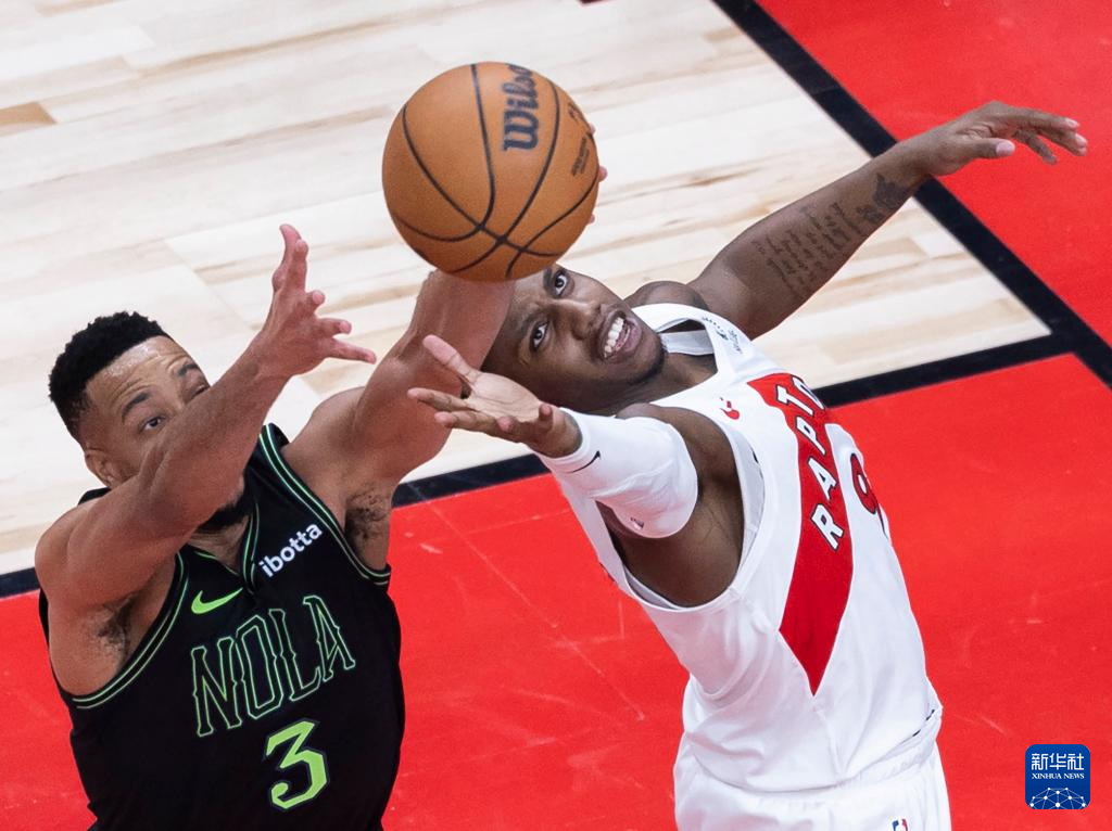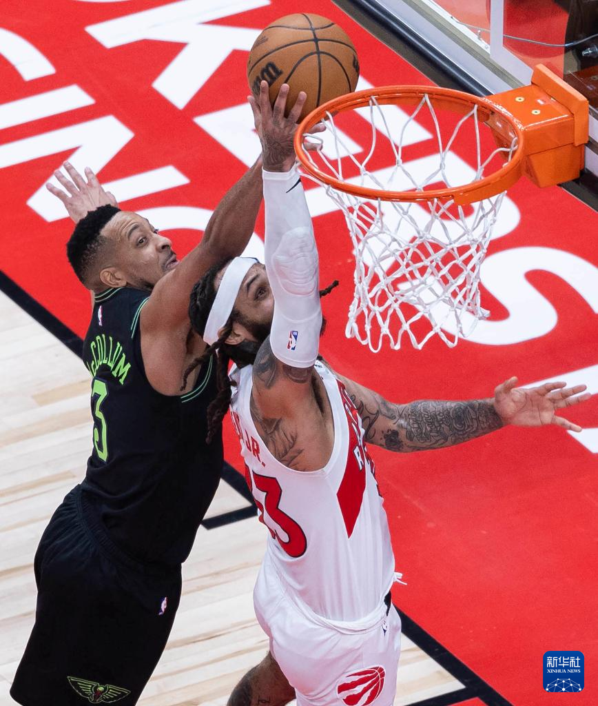 3月5日,鹈鹕队球员瓦兰丘纳斯(前)与猛龙队球员阿巴吉在比赛中争抢篮板球。新华社发(邹峥摄)