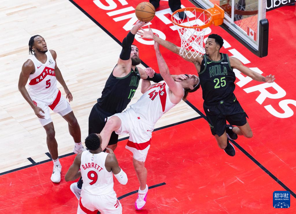 3月5日,鹈鹕队球员瓦兰丘纳斯(左三)、墨菲(右一)与猛龙队球员奥利尼克 (右二)在比赛中争抢篮板球。新华社发(邹峥摄)