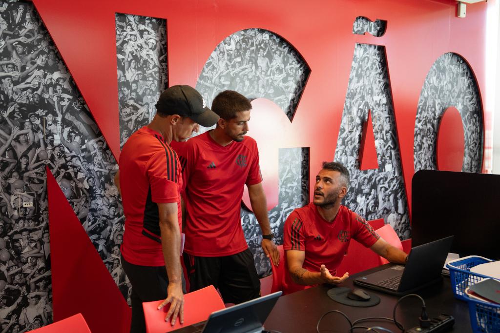 3月6日,教练员在弗拉门戈俱乐部青训基地办公室交谈。新华社记者 王天聪 摄