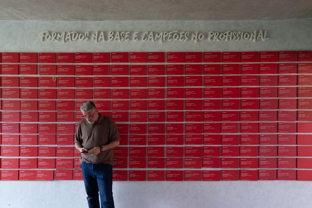 3月6日,在弗拉门戈俱乐部青训基地,一名工作人员站在一处荣誉墙前,墙上是基地培养出的夺得各项赛事冠军的球员名字。新华社记者 王天聪 摄