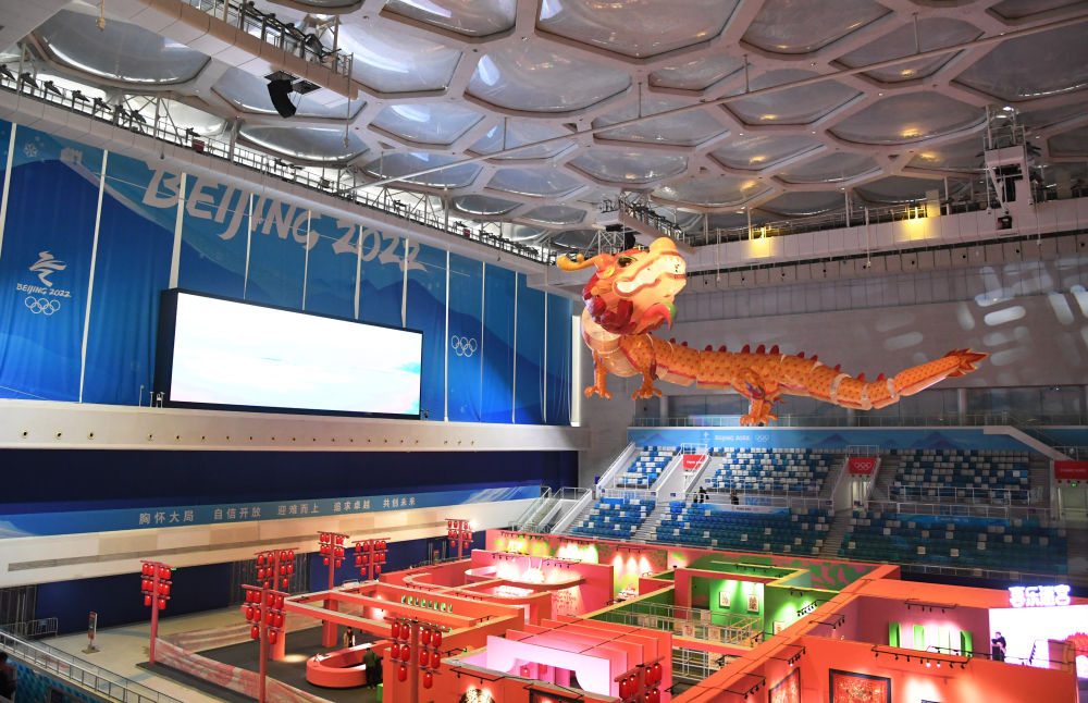 这是2024年2月3日在国家游泳中心“水立方”拍摄的“龙耀水立方,喜乐过龙年”跨年展览。展览以“龙”为核心要素,汇集了与龙相关的200余件文物,市民还可以体验多种互动项目。