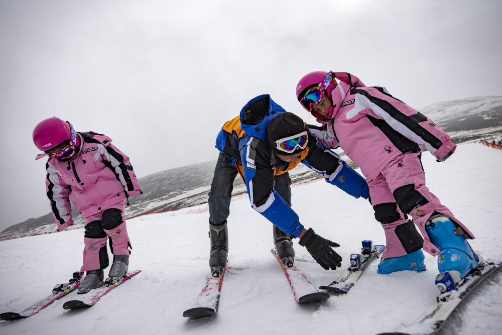 2024年1月27日,在墨多滑雪场,欧珠卓玛(左)、平措卓玛(右)在教练洛桑平措的帮助下学习滑雪。