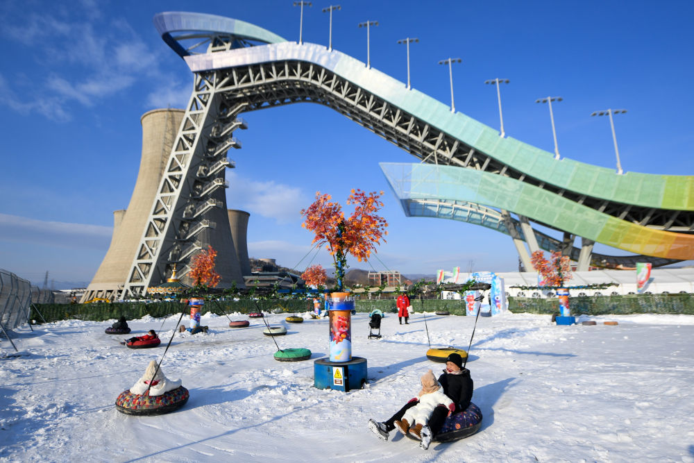 2023年12月24日,游客在首钢滑雪大跳台下的“首钢园冰雪汇”体验雪上游乐项目。“首钢园冰雪汇”是首钢园推动冬奥场馆可持续利用,在首钢大跳台打造的融合全民健身、冰雪娱乐、科技体验于一体的冬季潮玩戏雪乐园。