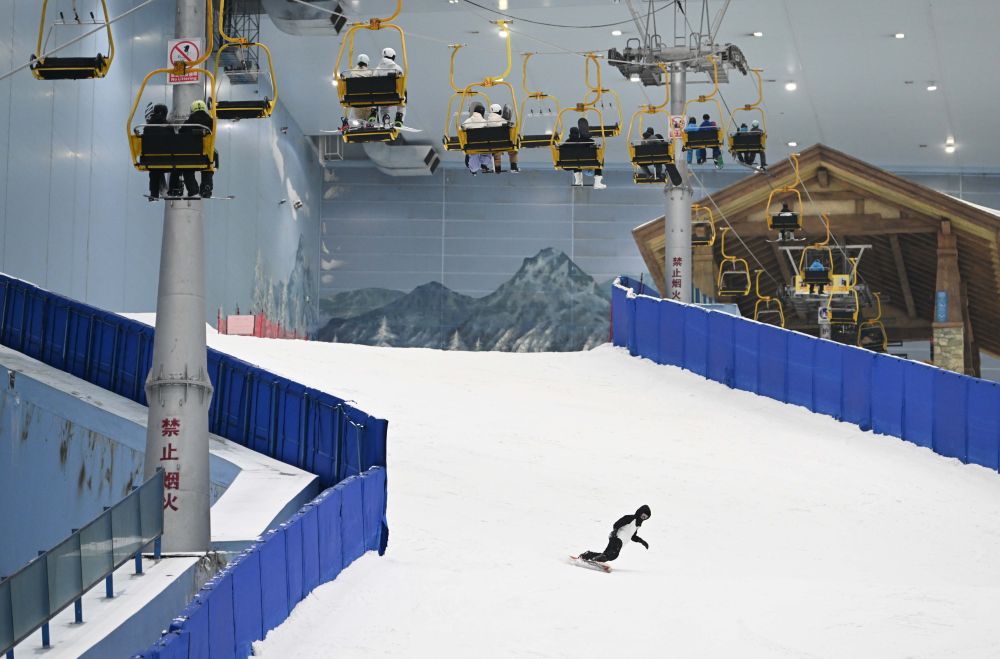 2024年1月26日,游客在广州热雪奇迹室内滑雪场游玩。