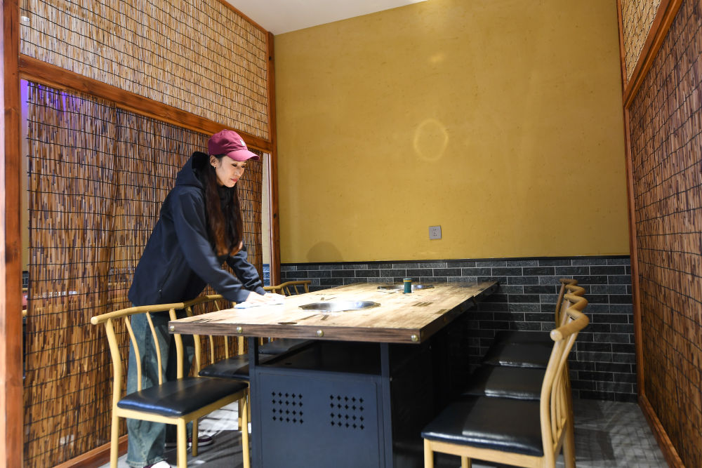2023年11月23日,王雪清洁整理民宿餐厅。