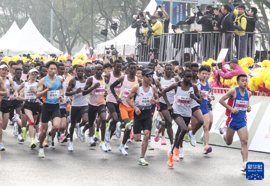 3月24日,何杰(左)在比赛中。最终,他以2小时06分57秒的成绩获得全国马拉松锦标赛(第一站)男子组冠军并创造了新的全国纪录。新华社记者 杨磊 摄