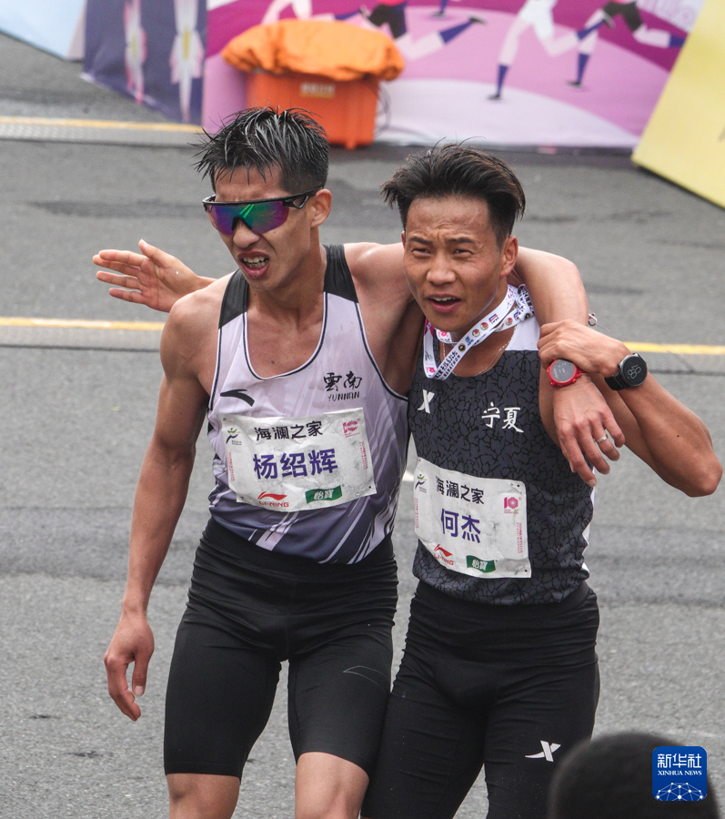 3月24日,何杰(右)在比赛后搀扶杨绍辉。何杰以2小时06分57秒的成绩获得全国马拉松锦标赛(第一站)男子组冠军并创造了新的全国纪录。新华社记者 杨磊 摄