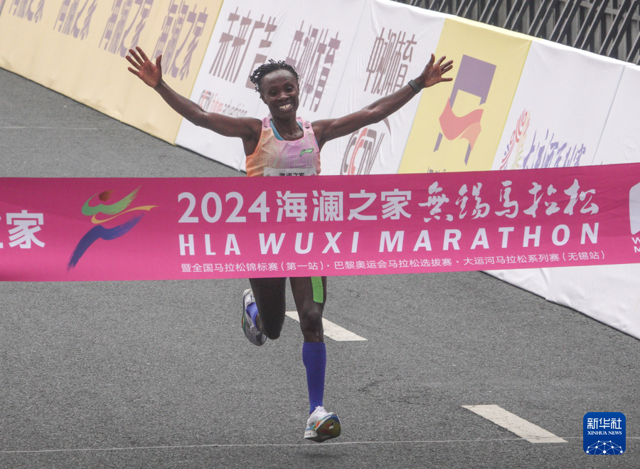 3月24日,肯尼亚选手维罗妮卡·恩杰里·马伊纳比赛中冲线。最终,她以2小时24分46秒的成绩获得2024无锡马拉松女子组冠军。新华社记者 杨磊 摄