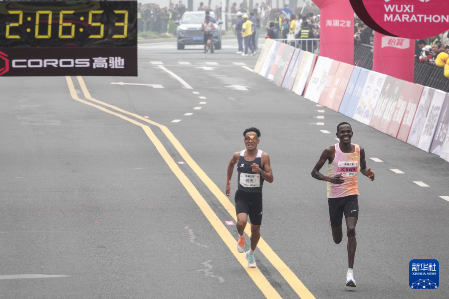 3月24日,埃塞俄比亚选手塔度·阿巴特·蒂姆在比赛中冲线。最终,他以2小时06分18秒的成绩获得2024无锡马拉松男子组冠军。新华社记者 杨磊 摄