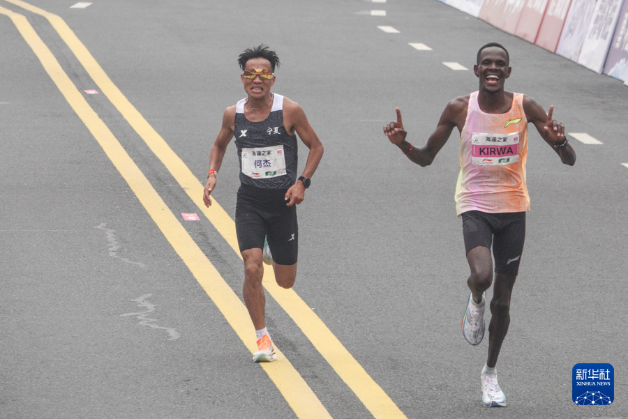 3月24日,何杰在比赛中冲线。最终,他以2小时06分57秒的成绩获得全国马拉松锦标赛(第一站)男子组冠军并创造了新的全国纪录。新华社记者 杨磊 摄