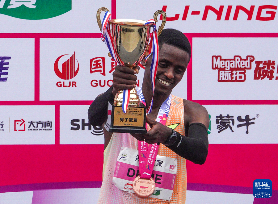3月24日,埃塞俄比亚选手塔度·阿巴特·蒂姆在2024无锡马拉松男子组颁奖仪式上举起奖杯。他以2小时06分18秒的成绩获得冠军。新华社记者 杨磊 摄