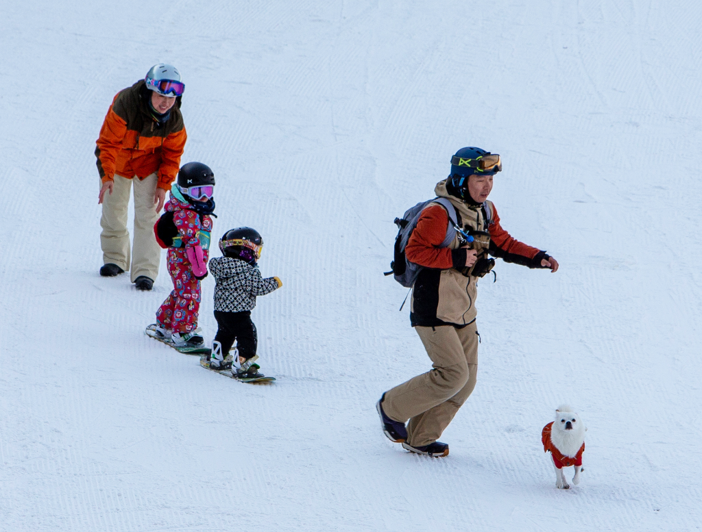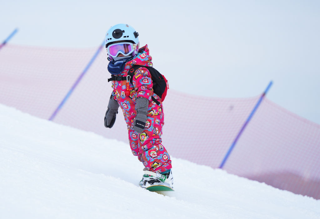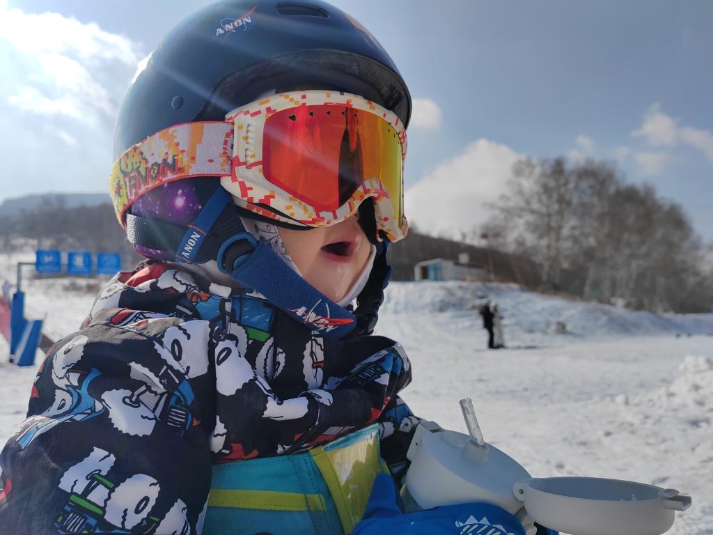 为了记录她人生首次体验单板滑雪