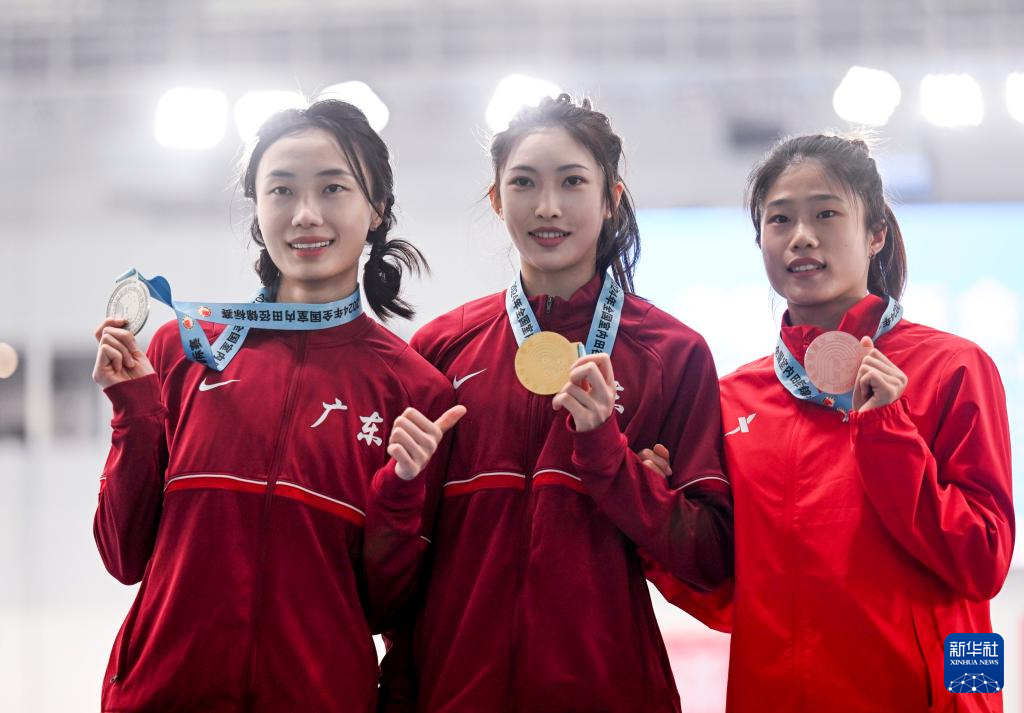 3月31日,冠军广东队选手陈洁(中)、亚军广东队选手曾蕊(左)和季军北京队选手谢亚展在女子三级跳远颁奖仪式上。
