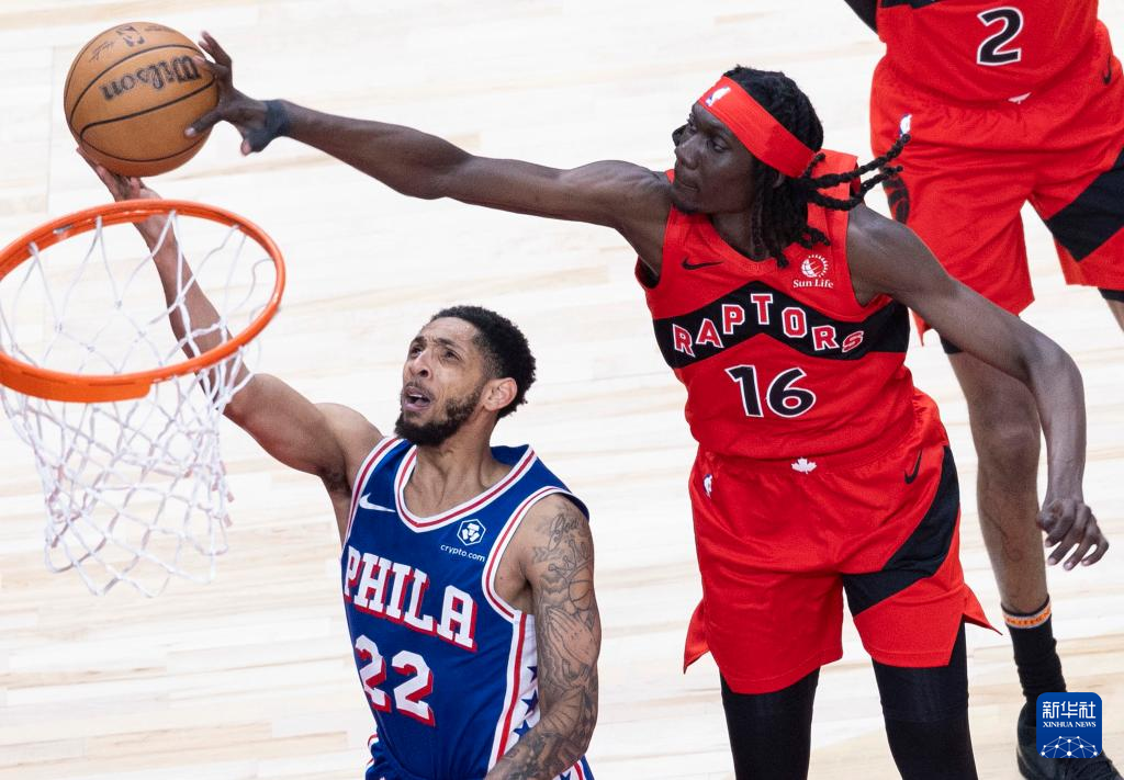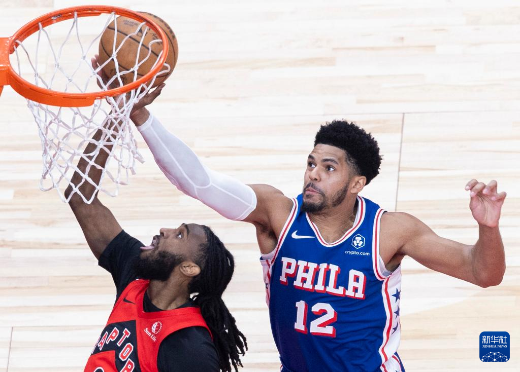 3月31日,76人队球员哈里斯(右)在比赛中封盖猛龙队球员弗里曼-利伯蒂的上篮。新华社发(邹峥摄)